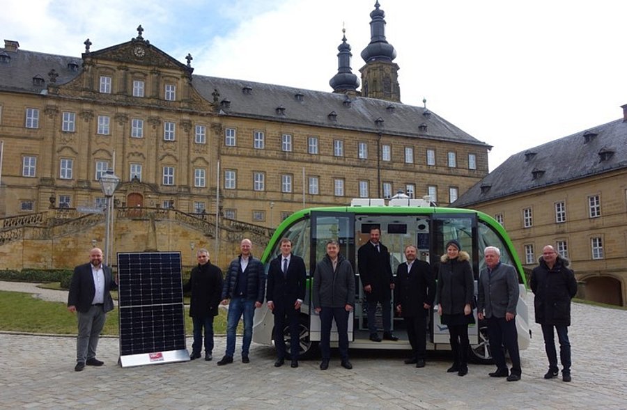 (v.l.: Dr. Jonas Geissler (MdB), Dr. Stratis Tapanlis (IBC Solar), Julius Becker (DLR), Prof. Dr. Maximilian Schiffer (TUM), Prof. Dr.-Ing. Benedikt Schmülling (BUW), Mario Schönwald (Bürgermeister Bad Staffelstein), Jörg Schrepfer (VALEO), Emmi Zeulner (MdB), Hellmut Fischer (Stellv. Landrat Kreis Lichtenfels), Miroslav Tesic (MAGMENT)) (Foto: Michael Böhm).