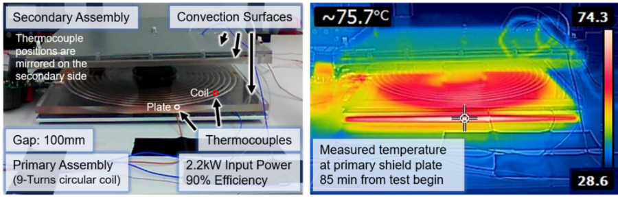 2. Abb.: Versuchsstand mit runden Spulen (links). Temperaturverteilung desselben Versuchsstandes nach 160 Minuten Betrieb mit einer Übertragungsleistung von 2kW (rechts).