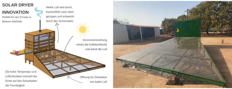 1. Abb.: Funktionsweise des Solar Dryers (links) und Prototyp (rechts).