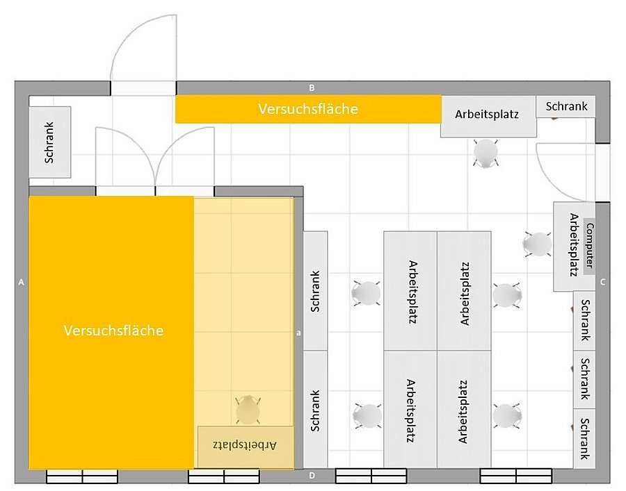 Die Abbildung zeigt Ihnen den Grundriss und die grobe Aufteilung des großen technischen Arbeitsraums. Wenn Sie auf den Grundriss klicken, vergrößert sich Ihre Ansicht.